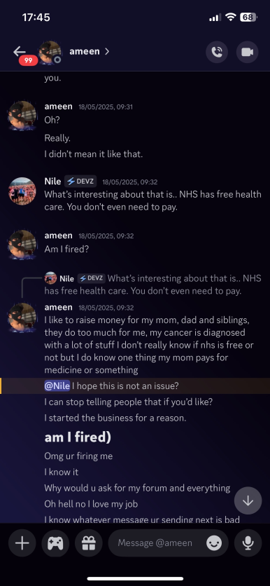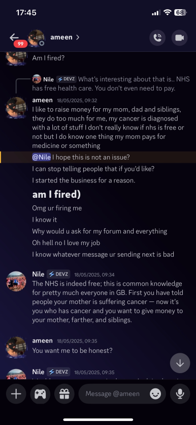 Description of blacklist: This server is owned by an individual who violated Discord Terms of Service, due to scamming Community Members within Nourity Corporation by asking for donations for his mother’s cancer treatment. After thorough investigation, it was found out that he lived in a country where healthcare is free. He then admitted to doing this to “earn money on Roblox and Discord to keep the apps”. This individual also was found out to be electronically dating as a minor, breaking the Teen and Child Safety Policy.